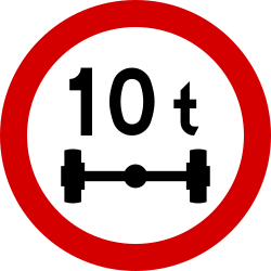 Znak ten oznacza zakaz ruchu pojazdów z naciskiem na pojedynczą oś napędową większą niż wskazana na nim wartość (w przypadku grupy osi nacisk żadnej z nich nie może przekraczać 80% masy wskazanej na znaku) |