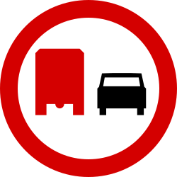 Znak ten zabrania wyprzedzania pojazdów silnikowych wielośladowych przez kierujących samochodami ciężarowymi o masie przekraczającej 3,5 t, ciągnikami samochodowymi, pojazdami specjalnymi lub wykorzystywanymi do celów specjalnych o masie przekraczającej 3,5 t |