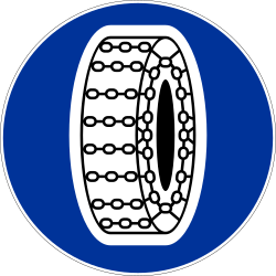 Znak ten oznacza nakaz stosowania łańcuchów przeciwpoślizgowych na co najmniej dwóch kołach napędowych na określonym fragmencie drogi |