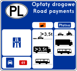 Znak ten informuje o opłatach drogowych wnoszonych za przejazd po drogach publicznych na terytorium Rzeczypospolitej Polskiej |