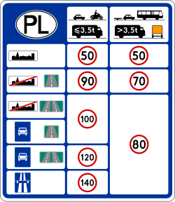 Znak ten informuje o dopuszczalnych limitach prędkości obowiązujących na terytorium Rzeczypospolitej Polskiej |