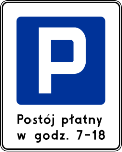 Znak ten oznacza wjazd do strefy, w której za postój pojazdu pobierana jest opłata |
